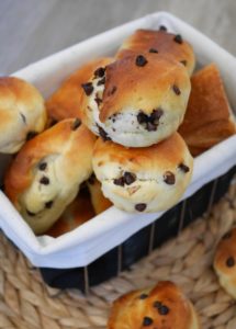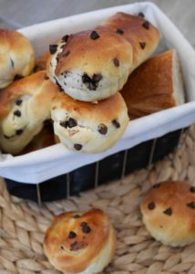 Une recette de baguettes viennoises aux pépites de chocolat (sans gluten) qui ravira petits et grands. Je vous l’accorde volontiers, la boulange (encore plus sans gluten) c’est long, laborieux, il y a souvent beaucoup de ratées (et c’est bien normal au début) mais c’est une telle fierté de réussir ses petits pains et surtout un vrai bonheur de les sortir du four le dimanche matin et de voir 2 gourmands arriver pieds nus et la tête enfarinées, attirés par la douce odeur du chocolat chaud et du pain brioché qui sort du four …