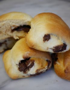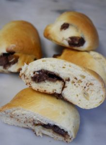 Étaler ensuite votre pâte, tartiner votre pâton puis le rouler. Découper ensuite des petits pains. Laisser pousser une seconde fois une trentaine de minutes à température ambiante puis mettre au four pour une douzaine de minutes à 180 degrés (très variable d'un four à l'autre, surveiller !)